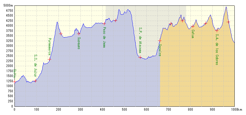 サルタ(Arg)、プルママルカ(Arg)、サンペドロ・デ・アタカマ(Chl)、サンアントニオ・デ・ロス・コブレス(Arg)、カファジャテ(Arg)、フィアンバラ(Arg)、コピアポ(Chl)、サンティアゴ(Chl)、メンドーサ(Arg)